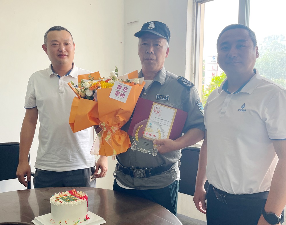 5 月 16 日,副總焦鵬前往劉國富的工作崗位,送上帶有司花的鮮花、蛋糕、總經(jīng)理筆簽的賀卡以及紀念水晶杯。當被問及為何能在公司堅守 17 年時,劉國富動情地說:“莆田燃氣事業(yè)部讓我學會了很多東西,所以我很想為公司服務?!?副總焦鵬也關切地詢問了他退休后的生活規(guī)劃,希望他能好好享受退休生活。