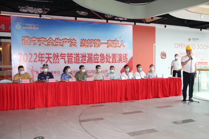 為全面提升突發(fā)燃氣事故的應急響應水平,有效預防和應對事故的發(fā)生,檢驗各應急搶險人員的應急響應、應急處置、協(xié)調組織及救援能力,確保人員密集場所燃氣供氣安全,曠遠能源仙游分公司于2022年6月24日上午9時聯合消防大隊、中駿世界城綜合體共同組織開展“天然氣管道泄漏應急處置演練”活動。演練活動在曠遠能源仙游分公司總經理柯軍的宣布下有序開展。本次事故模擬中駿世界城綜合體內部三樓大豐收餐飲店連接法蘭漏氣引發(fā)..